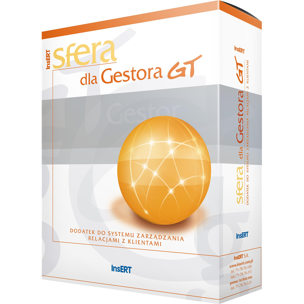 Gestor GT Sfera to wszechstronny system wspomagający budowanie trwałych relacji z klientami. Program jest rozszerzoną wersją Gestora GT, wzbogaconą o dodatek Sfera dla Gestora GT - mechanizm pozwalający na dowolną rozbudowę systemu i dostosowanie go do specyficznych wymagań przedsiębiorstwa. Za jego pomocą możliwe jest stworzenie nawet najbardziej wyszukanych rozwiązań informatycznych, które zaspokoją nietypowe potrzeby firmy.